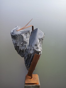 2020Beeld in cortenstaal en noir de mazy. Steen is aanleidinf tot vorm en staal maakt het compleet en zet de beweging in de ruimte voort